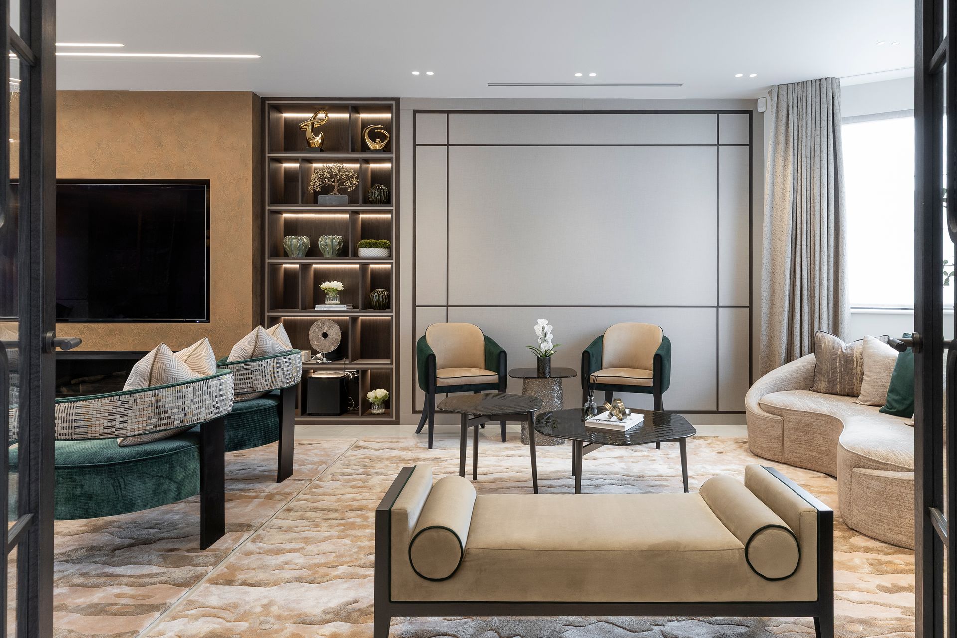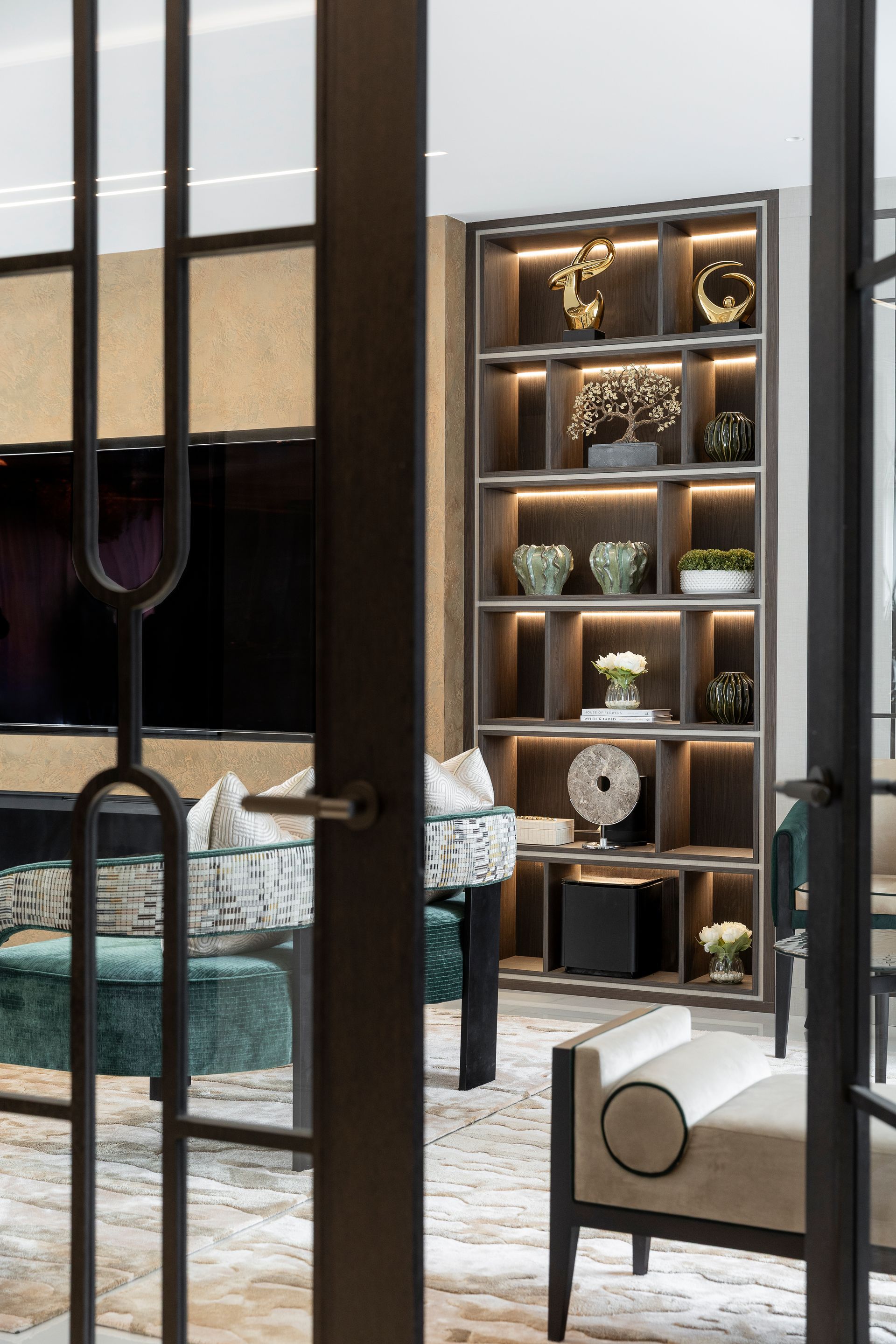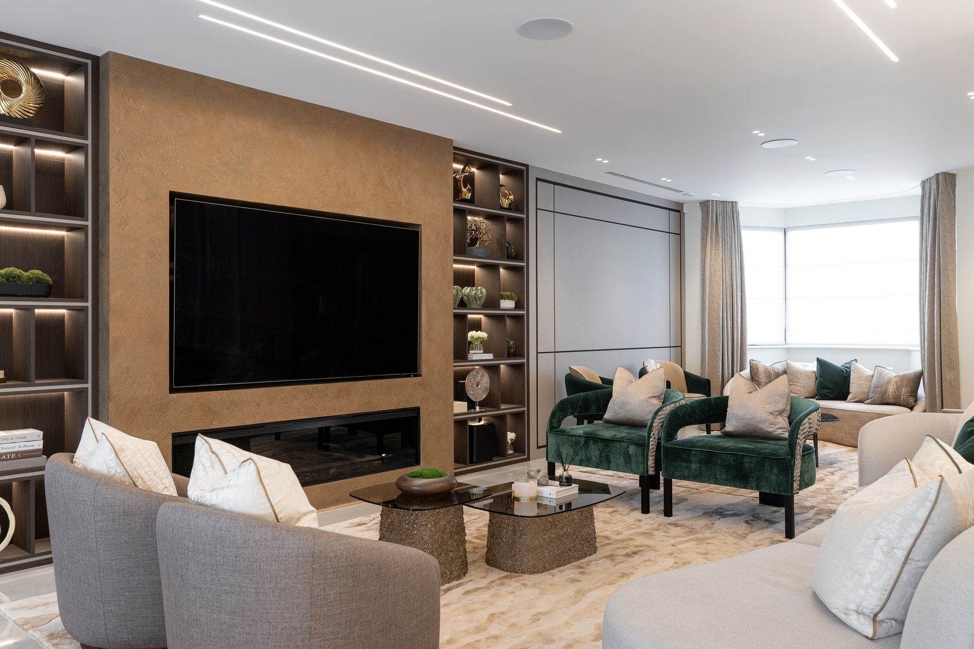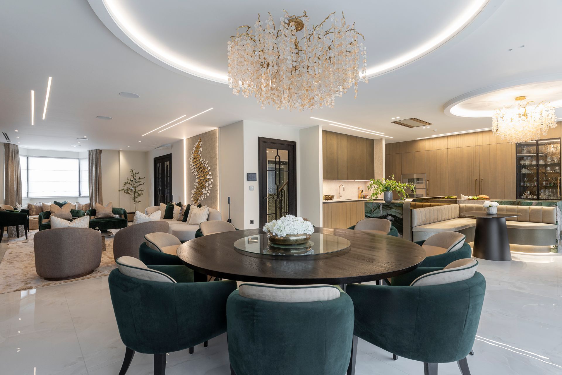 This project began with a vision of contemporary luxury, shaped around the client’s love of green as an accent colour. The kitchen features a show-stopping green marble which sets the tone for the entire ground floor. This unique element becomes a subtle thread that runs throughout the interiors, reappearing in carefully considered green accents, finishes, and bespoke details.