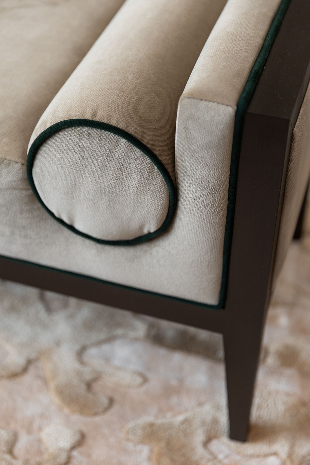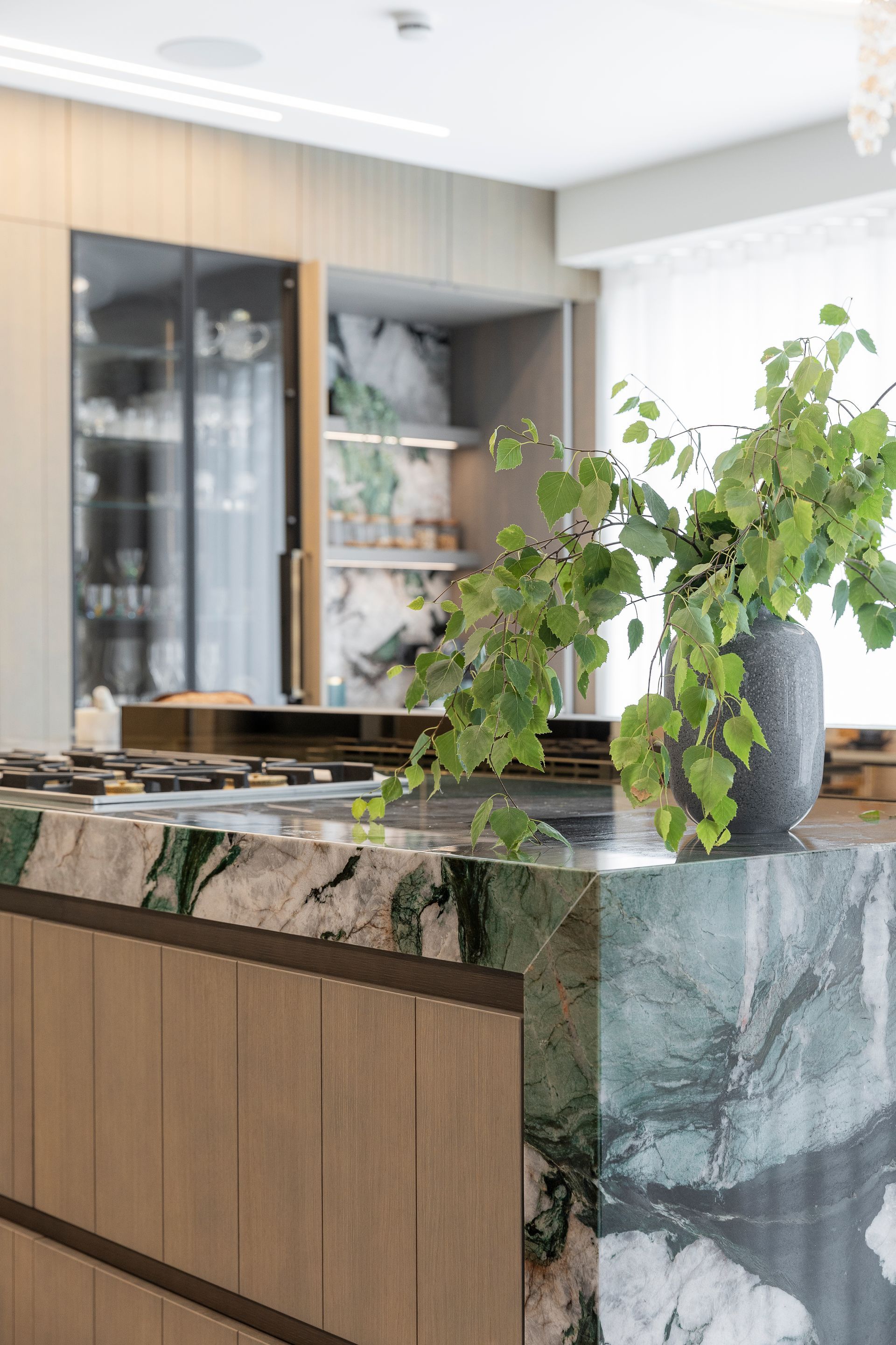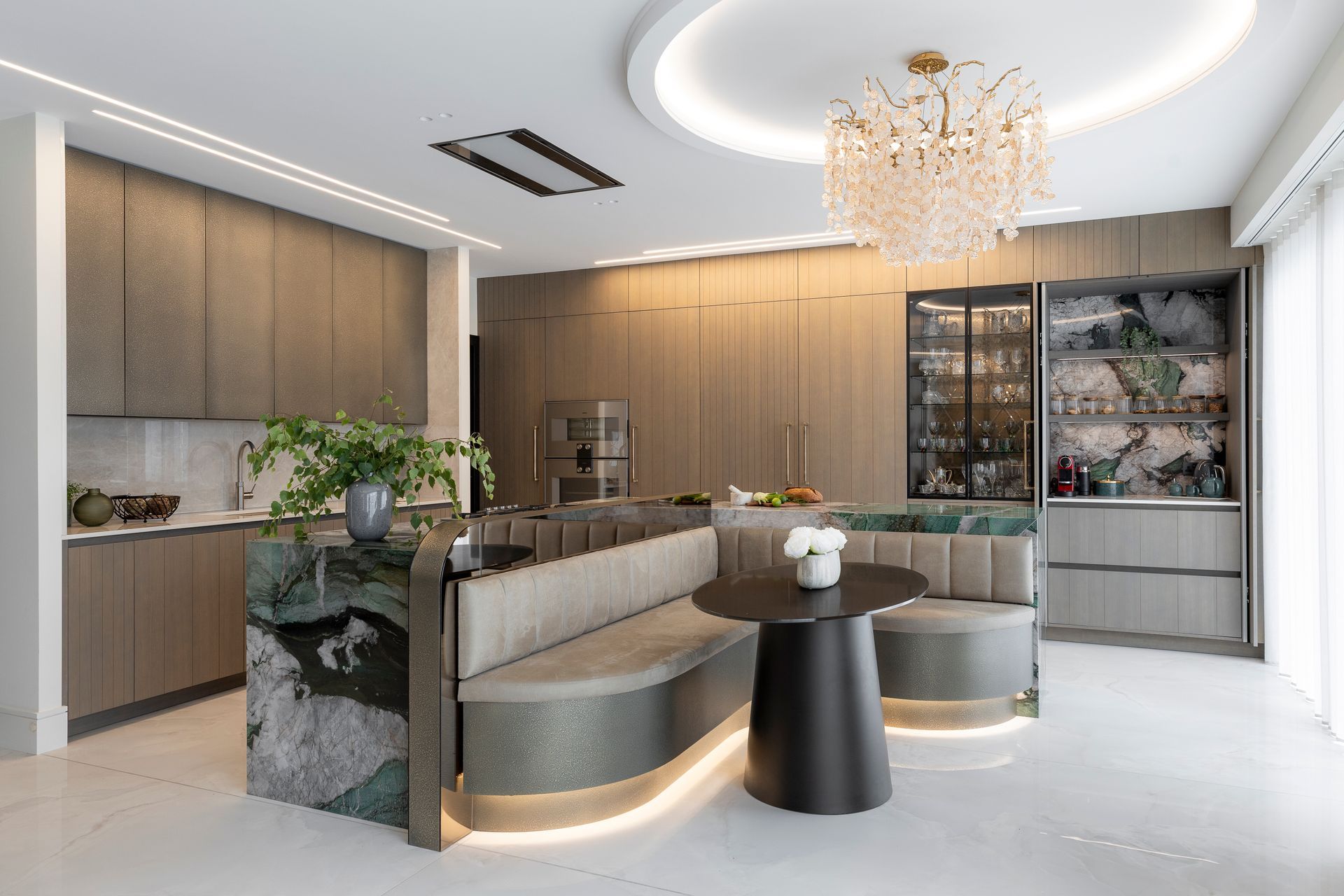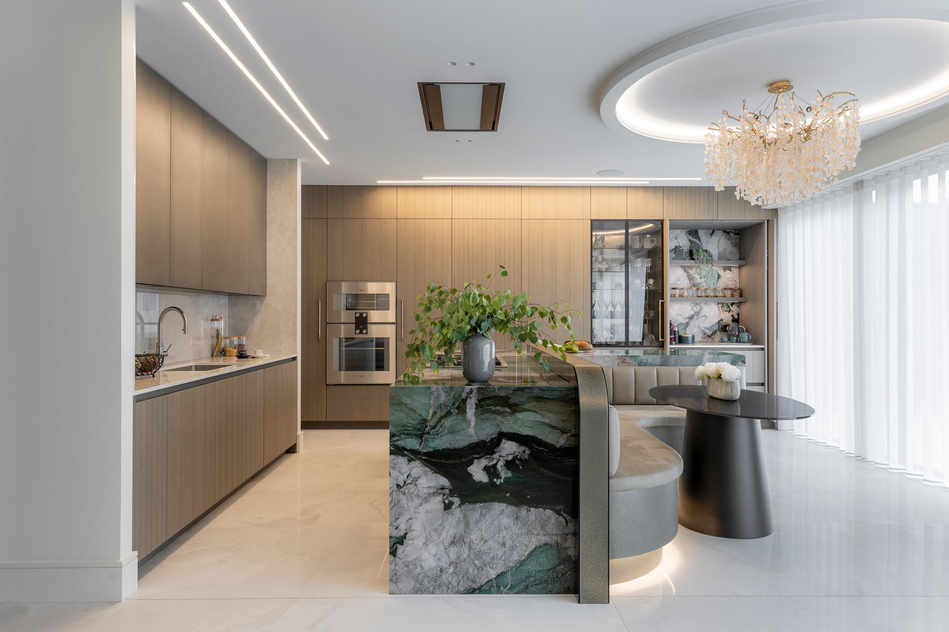 This project began with a vision of contemporary luxury, shaped around the client’s love of green as an accent colour. The kitchen features a show-stopping green marble which sets the tone for the entire ground floor. This unique element becomes a subtle thread that runs throughout the interiors, reappearing in carefully considered green accents, finishes, and bespoke details.
